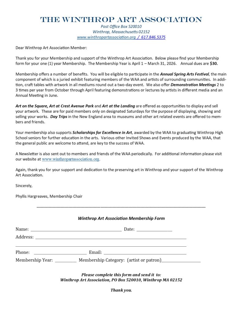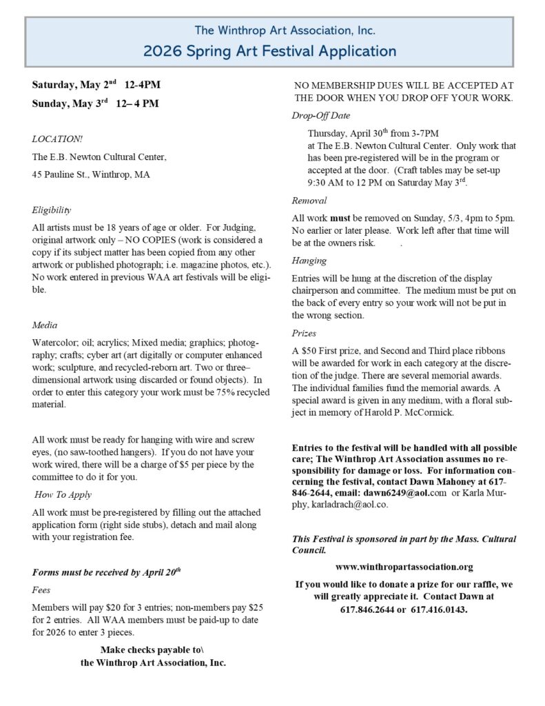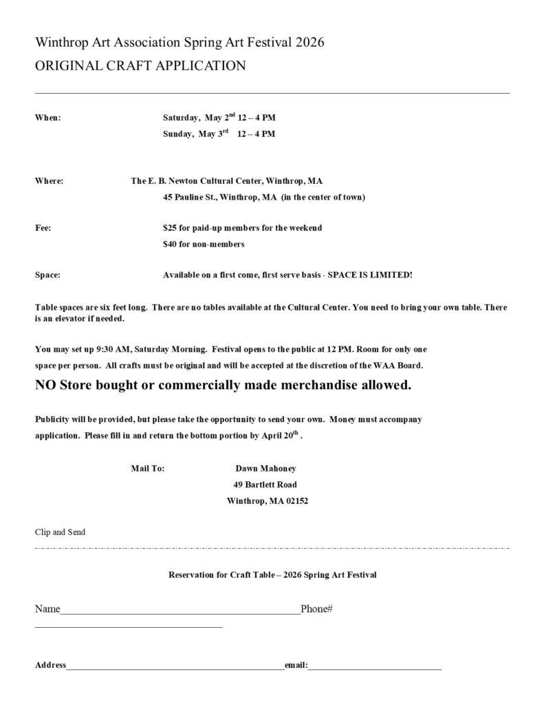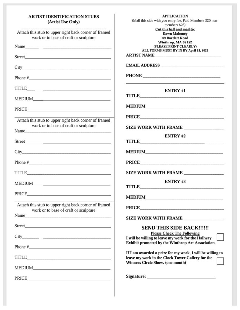 Print out the form and send it, along with your check, to: Winthrop Art Association, PO Box 520010, Winthrop, MA 02152.  Thank you and hope to see you at the Art Festival!